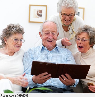 Organizing Photo Albums at Home Indoor Activity for Seniors – Group Activity. Group of old friends going down memory lane viewing an album.
